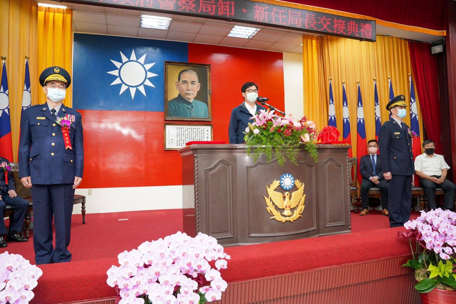 『記者:高朝祈 高屏報導』 高雄市警察局卸任、新任局長交接典禮,今(11)日在市警局大禮堂舉行,卸任警察局長黃明昭升任警政署署長,新任警察局長由警政署警政委員林炎田出任,交接典禮由市長陳其邁主持,警政署副署長劉柏良擔任監交人,高雄市議會議長曾麗燕亦出席。陳其邁肯定黃局長於任內的表現,並感謝基層同仁除維護治安工作外,在防疫期間的全力協助,也期勉新任林局長在好的基礎上,更加精進治安的作為,帶領所有警察同仁,盡心盡力的保護市民安全,落實治安工作。 陳其邁表示,過去兩年內高雄市槍擊案降到六都第二低,今年是六都最低,感謝卸任黃明昭局長任內傑出的表現,也特別感謝所有基層同仁的努力,過去恪遵法令、盡忠職守,堅定執行各項防範犯罪工作,讓高雄市在各項表現包括重大刑案、暴力犯罪、槍擊案等,交出亮麗成績單,提供市民朋友安定生活與良好的治安環境。