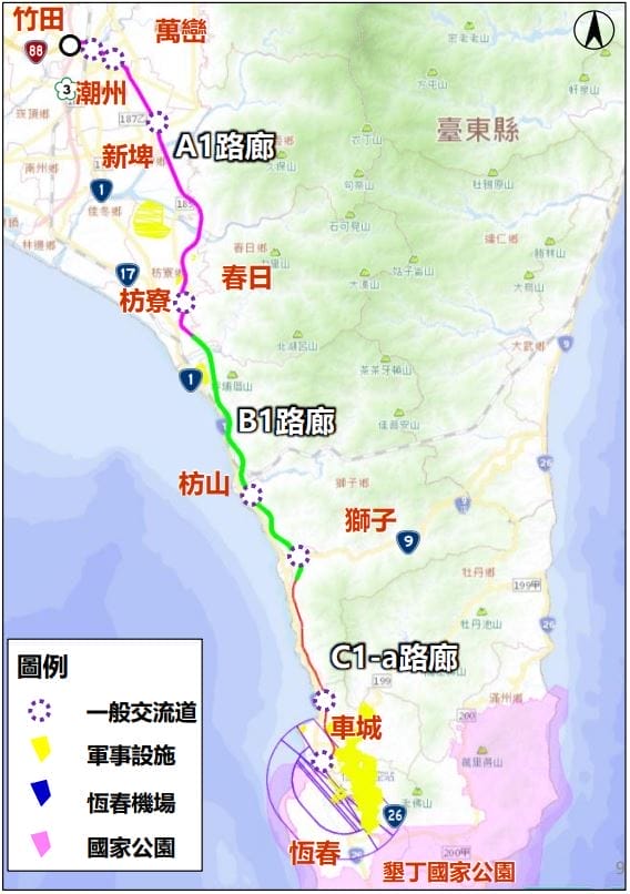 依據交通部公路局規劃,屏南快速公路路廊從竹田台88快速公路延伸至恆春,沿屏東平原東側至枋寮往南續沿山側丘陵區,經枋山、車城銜接至恆春鎮北端,可服務潮州、萬巒、新埤、春日、枋寮、枋山、獅子、車城及恆春等鄉鎮。