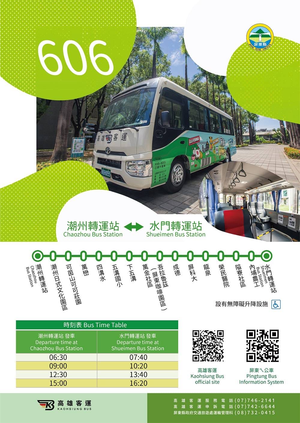『記者:洪祥富 高屏報導』為完善屏東縣公共運輸路網,及帶動縣道187線沿線觀光景點,屏東縣政府自111年8月1日起新闢606公車路線,串聯潮州日式建築園區、可茵山可可莊園、隘寮社區等深具在地文化特色景點,銜接縣內潮州、水門兩大轉運站,每日提供8班次接駁服務,歡迎民眾多加搭乘利用!繼3~5月份彩帽鳳梨田雙層巴士活動成功推廣後,目前沿山公路-縣道185線沿線景點每到假日總湧入許多觀光遊客,已然發展為屏東縣境內熱門觀光廊道。然而,鄰近縣道187線沿線所擁有的景點亦不讓其專美於前:體驗濃厚日本風情的潮州日式建築園區、典藏濃醇巧克力的可茵山可可莊園、飄香萬里的萬巒豬腳街、客家純樸文化的五溝社區、全台最古老的萬金教堂、產銷一體化的屏東咖啡園區、薄鹽醬油全台聞名的屏科大、美味黃荊風味餐的隘寮社區等,每個點好拍、好玩、又好吃!