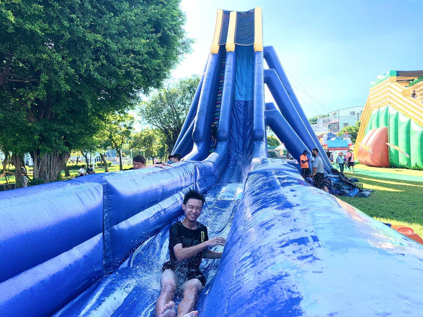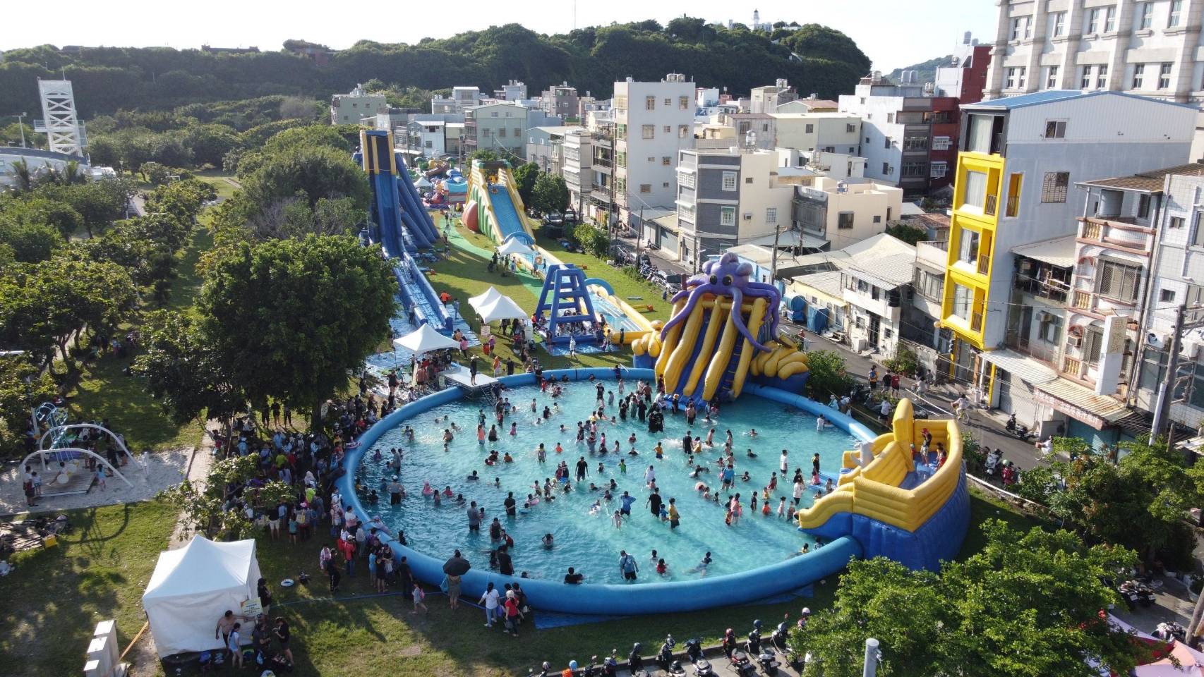 『記者:謝坤忠 高屏報導』 漢神巨蛋廣場有大象出沒?!2022旗津黑沙玩藝節再加碼,繼大型氣墊樂園外,觀光局今年也與漢神巨蛋購物廣場攜手,在百貨前廣場打造戲水大象沙雕,引起逛街民眾的矚目及搶拍,為旗津暑期活動再創話題。這個週末不知道要帶孩子去哪裡玩嗎?快來旗津欣賞「動物狂歡派對」的主題沙雕,還有免費玩到飽的大型氣墊樂園,本周六(7月30日)旗津啤酒嘉年華將邀請樂團YILITH及星光四少周定緯帶來經典流行歌曲翻唱,歡迎民眾一同徜徉於充滿青春及回憶的音樂饗宴中。觀光局長周玲妏表示,炎炎夏日的暑假期間,為提供大小朋友消暑的娛樂,特別安排了大型的氣墊樂園,還搭配戲水氣墊,首週就吸引許多家長帶著小朋友到現場玩樂消暑,即日起至9月4日,每周五六日13:30-18:30免費提供遊客暢玩。現場有高達15公尺尖叫聲破表的急速滑水道、長65公尺以游泳圈滑行的城市滑水道、直徑26公尺的巨無霸戲水池,許多小朋友攜帶各種戲水玩具、水槍、泳圈入場戲水,體驗俯衝而下的刺激感,如果家長沒有準備換洗衣物也沒關係,還有熊貓竹林樂園、斑馬親子樂園、海洋親子樂園及工程師跳床等各式亮麗繽紛的主題蹦跳氣墊,現場反應熱烈,小朋友怎麼跳、怎麼滑、怎麼拍都好玩。來到氣墊樂園,記得不要佩戴尖銳物品,穿著輕鬆服飾,帶著愉快的心情,一起來消暑。