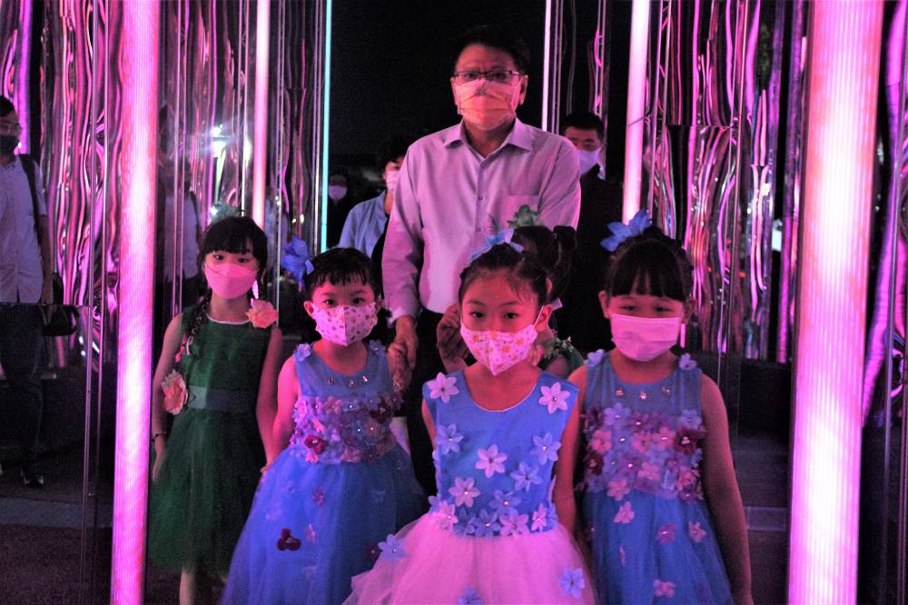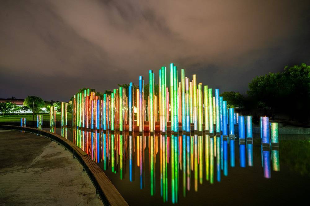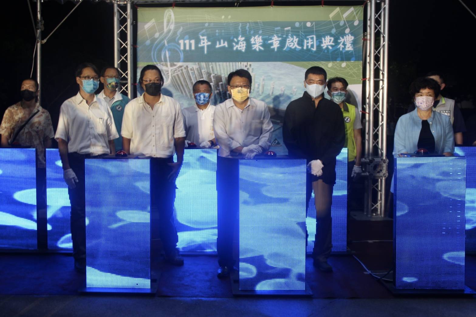 『記者:張智嵐 高屏報導』 縣民公園紙漿廠旁大草原於今(15)日舉行藝術作品「山海樂章」啟用典禮,以「山、海、光」為概念,將屏東的意象凝縮於作品中,融合屏東的海洋與北大武山的意象,堆疊出波光粼粼的海浪,並與高低起伏的山脈交疊,象徵著屏東所孕育的各式多元共融情境。 屏東戰隊、屏東阿緱囝仔帶來精彩的開場表演,啟用典禮由縣長潘孟安、副縣長吳麗雪、營建署下水道工程處南區分處分處長林厚名等貴賓共同參與,一起見證絢麗科幻的光柱啟用,並正式開放民眾體驗。 看到五彩斑斕並富含意義的裝置藝術在今天啟用,潘縣長感慨的說,縣民公園曾經是一個破敗的倉庫,偌大一片土地下埋了許多廢棄物,導致土壤充滿了強鹼的物質,不論是花草樹木都種不起來,經過多年的努力,慢慢爬梳,終於成為受國際肯定、民眾讚許的縣民公園。 潘縣長表示,縣民公園目前的成果得來不易,從最初與台糖積極協調,讓其以代管方式交給縣府閒置近20年的土地,施作工程中,挖到舊有的地坑及水池等紙漿廠工業遺構,但是縣府團隊不畏艱難,基於歷史的延續,將台糖紙漿廠的前世,打造成可近式地景的今生,完工以來,已榮獲國內外藝文及設計大獎共13座,為了持續增厚此場域的文化底蘊,行銷屏東品牌,此次規劃「山海樂章」藝術作品,希冀將屏東故事繼續傳播,讓屏東於世界發光。