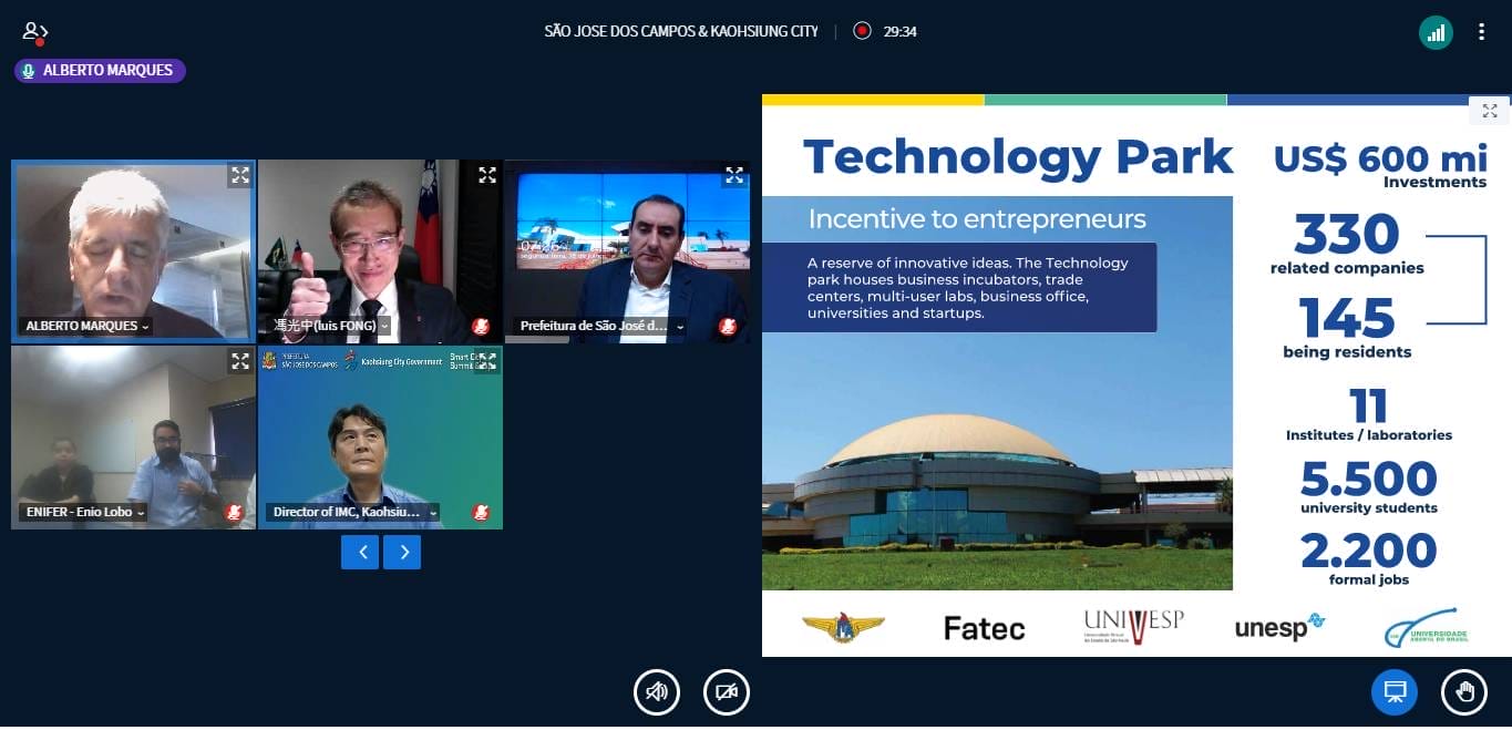 在會中,聖久坎普市府經濟發展暨創新廳長馬奎斯除了分享選定重點發展的物聯網與通訊基礎設施、農業、永續能源、電動車、智慧服務與醫療等產業外,對高雄市智慧城市發展與製造業等產業的數位轉型也表達高度興趣,並互邀組團參訪深入瞭解彼此智慧城市發展環境及優惠投資措施,雙方攜手搶攻國際商機。